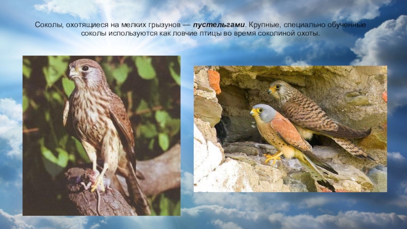 Слайд 7Соколы, охотящиеся на мелких грызунов — пустельгами. Крупные, специально обученные соколы