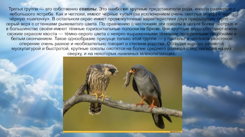 Слайд 13Третья группа — это собственно соколы. Это наиболее крупные представители рода,