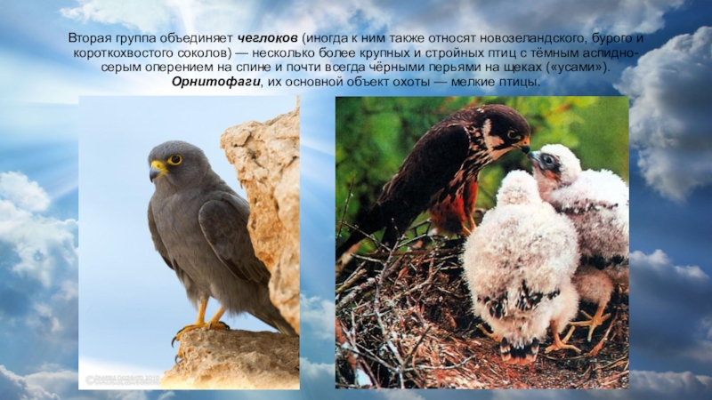 Слайд 12Вторая группа объединяет чеглоков (иногда к ним также относят новозеландского, бурого