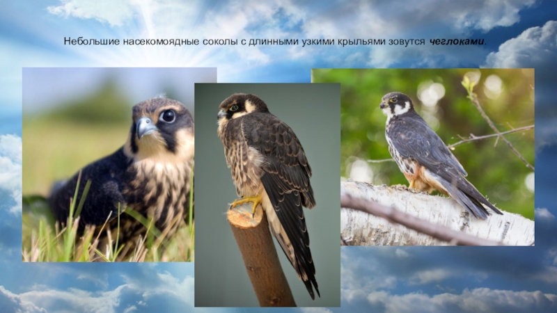 Слайд 6Небольшие насекомоядные соколы с длинными узкими крыльями зовутся чеглоками.