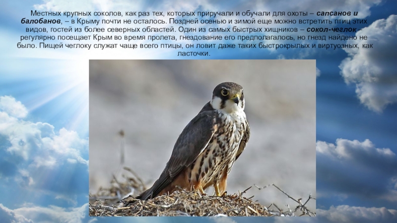 Слайд 16Местных крупных соколов, как раз тех, которых приручали и обучали для