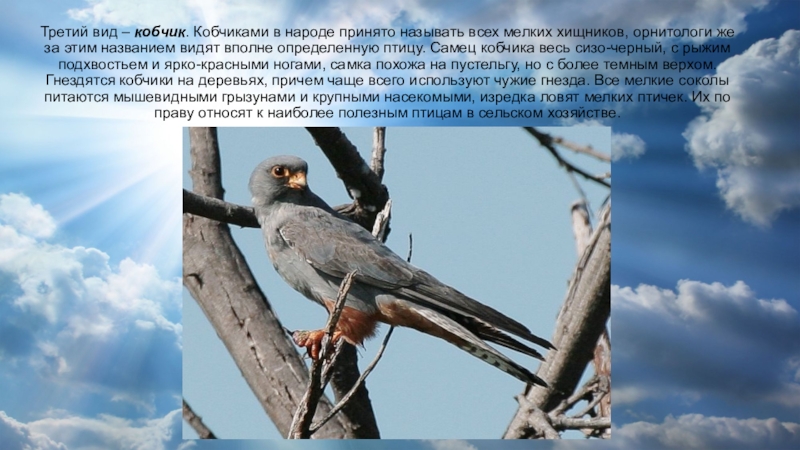 Слайд 20Третий вид – кобчик. Кобчиками в народе принято называть всех мелких