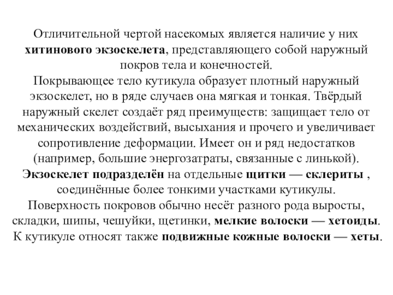 Слайд 4Отличительной чертой насекомых является наличие у них хитинового экзоскелета, представляющего собой