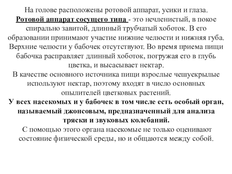 типа - это нечленистый, в покое спирально завитой, длинный трубчатый хоботок. В его образовании принимают участие нижние челюсти и нижняя губа. Верхние челюсти у бабочек отсутствуют. Во время приема пищи бабочка расправляет длинный хоботок, погружая его в глубь цветка, и высасывает нектар.