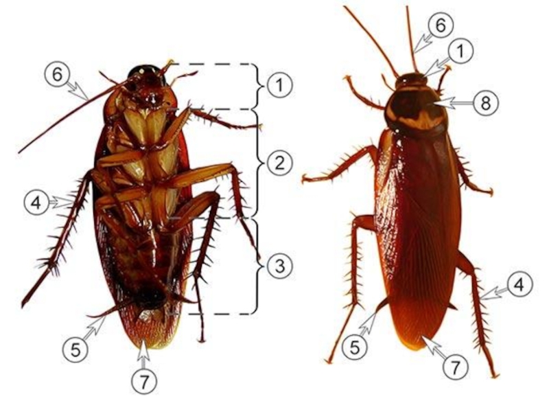 6. Вывод: Перечислите характерные черты внешнего строения насекомых как представителей членистоногих. Докажите, что бабочка и рыжий таракан – насекомые.