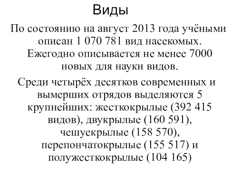 Среди четырёх десятков современных и вымерших отрядов выделяются 5 крупнейших: жесткокрылые (392 415 видов), двукрылые (160 591), чешуекрылые (158 570), перепончатокрылые (155 517) и полужесткокрылые (104 165)