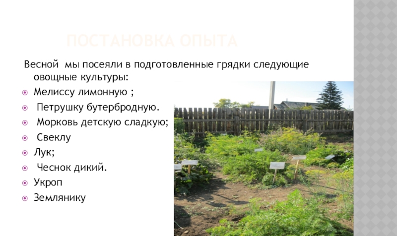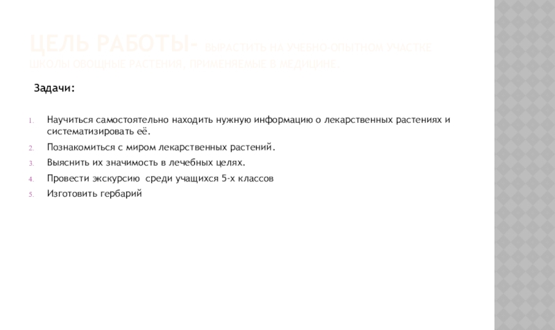 Слайд 2ЦЕЛЬ РАБОТЫ- ВЫРАСТИТЬ НА УЧЕБНО-ОПЫТНОМ УЧАСТКЕ ШКОЛЫ ОВОЩНЫЕ РАСТЕНИЯ, ПРИМЕНЯЕМЫЕ В
