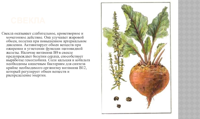 Свекла оказывает слабительное, кроветворное и мочегонное действие. Она улучшает жировой обмен,