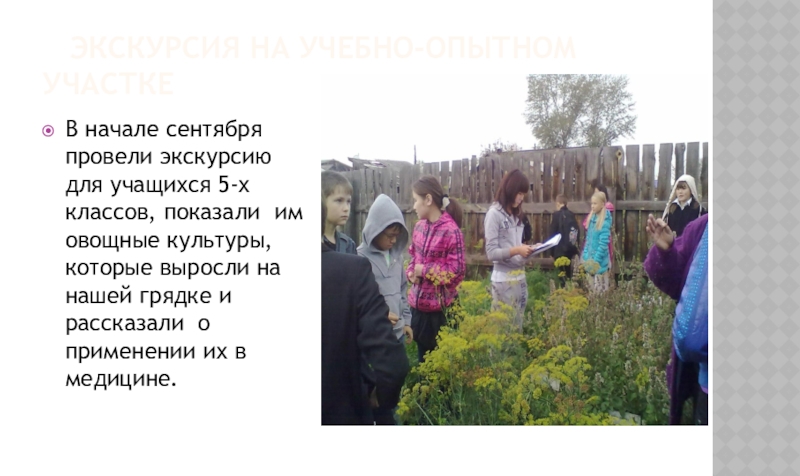 учащихся 5-х классов, показали им овощные культуры, которые выросли на нашей грядке и рассказали о применении их в медицине.