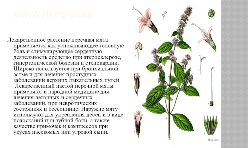 Лекарственный настой перечной мяты применяют в народной медицине для лечения легочных и сердечных заболеваний, при невротических состояниях и бессоннице. Наружно мяту используют для укрепления десен и в виде полосканий при зубной боли, а также качестве примочек и компрессов при укусах насекомых или угревой сыпи.