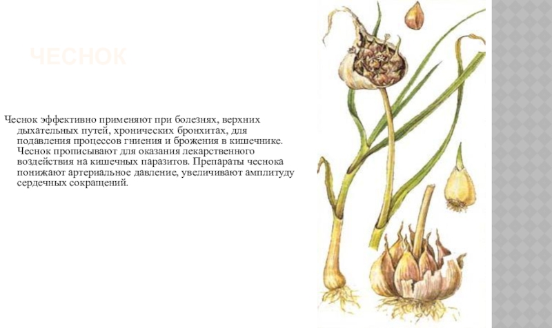 процессов гниения и брожения в кишечнике. Чеснок прописывают для оказания лекарственного воздействия на кишечных паразитов. Препараты чеснока понижают артериальное давление, увеличивают амплитуду сердечных сокращений.