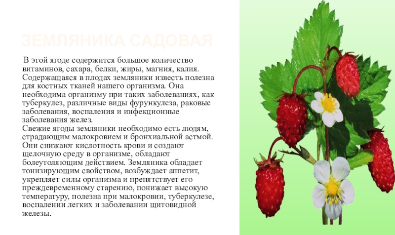 белки, жиры, магния, калия. Содержащаяся в плодах земляники известь полезна для костных тканей нашего организма. Она необходима организму при таких заболеваниях, как туберкулез, различные виды фурункулеза, раковые заболевания, воспаления и инфекционные заболевания желез.