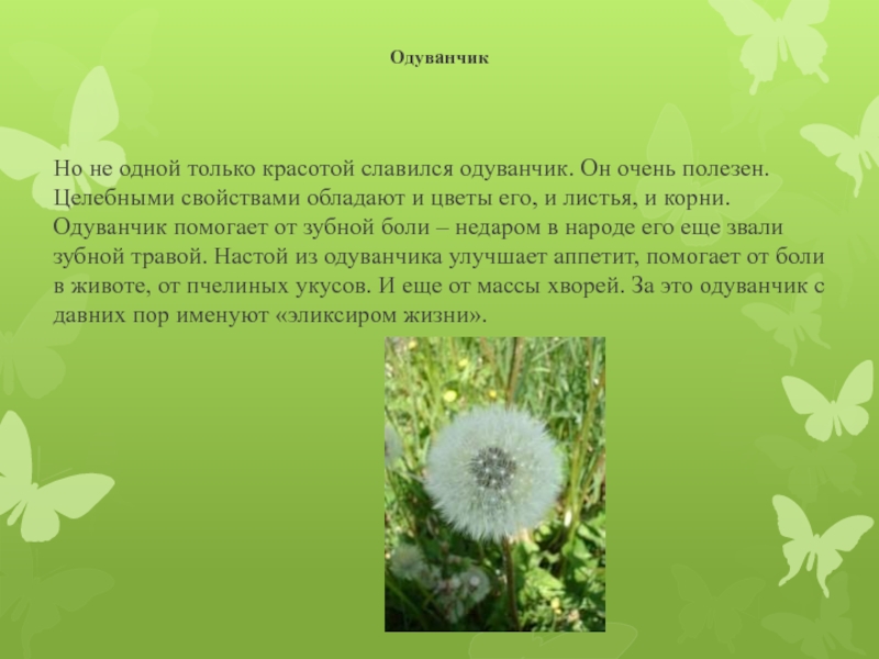 свойствами обладают и цветы его, и листья, и корни. Одуванчик помогает от зубной боли – недаром в народе его еще звали зубной травой. Настой из одуванчика улучшает аппетит, помогает от боли в животе, от пчелиных укусов. И еще от массы хворей. За это одуванчик с давних пор именуют «эликсиром жизни».