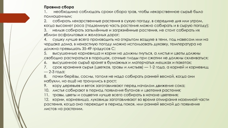 1. необходимо соблюдать сроки сбора трав, чтобы лекарственное сырьё было