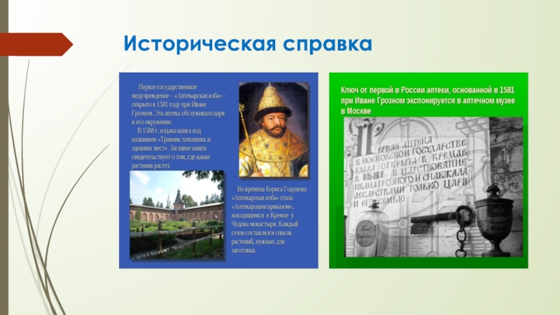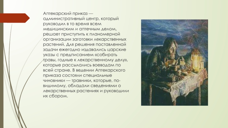 медицинским и аптечным делом, решает приступить к планомерной организации заготовки лекарственных растений. Для решения поставленной задачи ежегодно издавались царские указы с предписанием «собирать травы, годные к лекарственному делу», которые рассылались воеводам по всей стране. В ведении Аптекарского приказа состояли специальные чиновники — травники, которые, по-видимому, обладали сведениями о лекарственных растениях и руководили их сбором.
