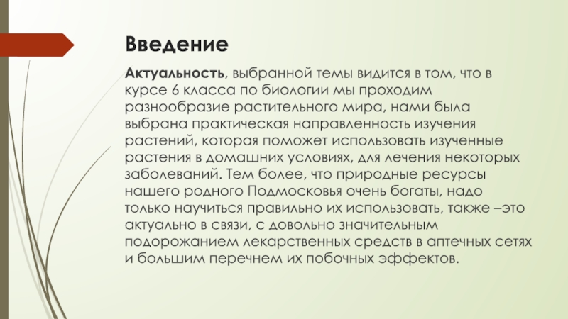 по биологии мы проходим разнообразие растительного мира, нами была выбрана практическая направленность изучения растений, которая поможет использовать изученные растения в домашних условиях, для лечения некоторых заболеваний. Тем более, что природные ресурсы нашего родного Подмосковья очень богаты, надо только научиться правильно их использовать, также –это актуально в связи, с довольно значительным подорожанием лекарственных средств в аптечных сетях и большим перечнем их побочных эффектов.