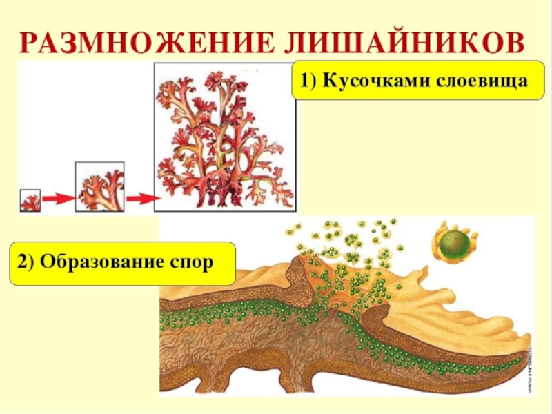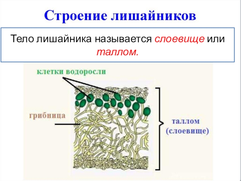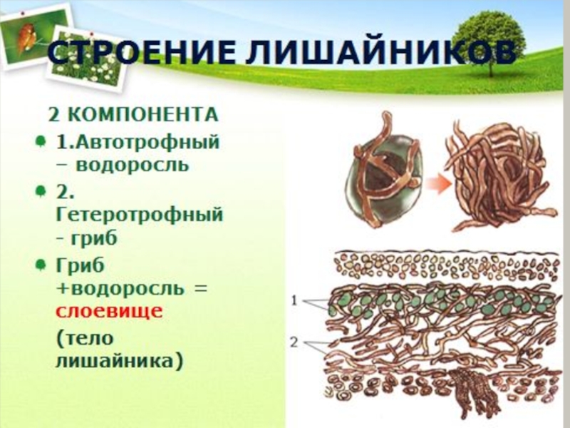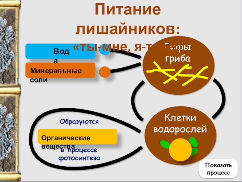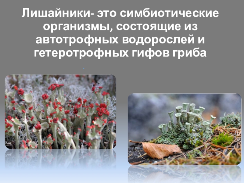 Лишайники – это симбиотические организмы, состоящие из гриба и водоросли; Водоросли создают в процессе фотосинтеза органические вещества. Грибы – создают “каркас” слоевища и обеспечивают водой и минеральными веществами