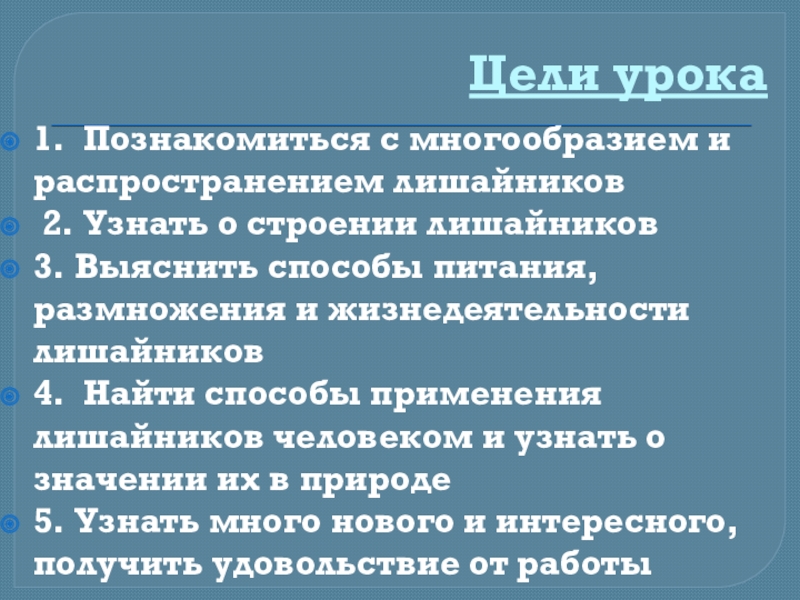 Цели урока1. Познакомиться с многообразием и распространением лишайников 2. Узнать о строении лишайников3. Выяснить способы питания, размножения и жизнедеятельности лишайников4. Найти способы применения лишайников человеком и узнать о значении их в природе5. Узнать много нового и
