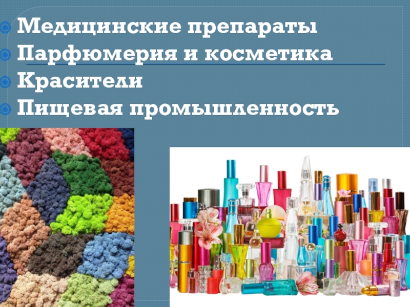 Медицинские препаратыПарфюмерия и косметикаКрасителиПищевая промышленность