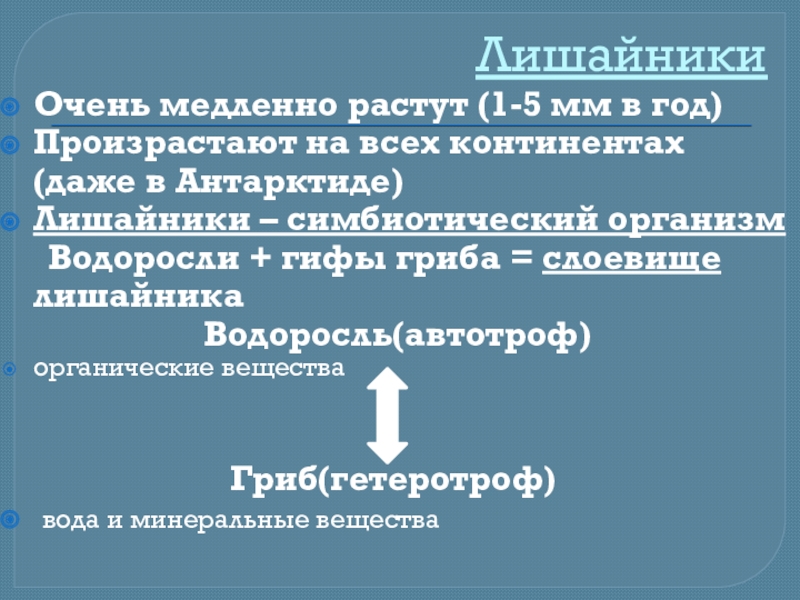ЛишайникиОчень медленно растут (1-5 мм в год)Произрастают на всех континентах (даже в Антарктиде)Лишайники – симбиотический организм	Водоросли +