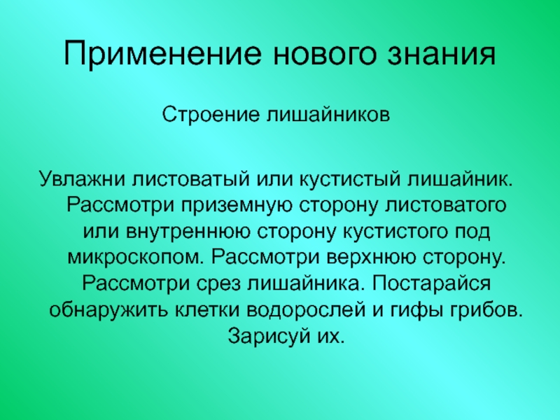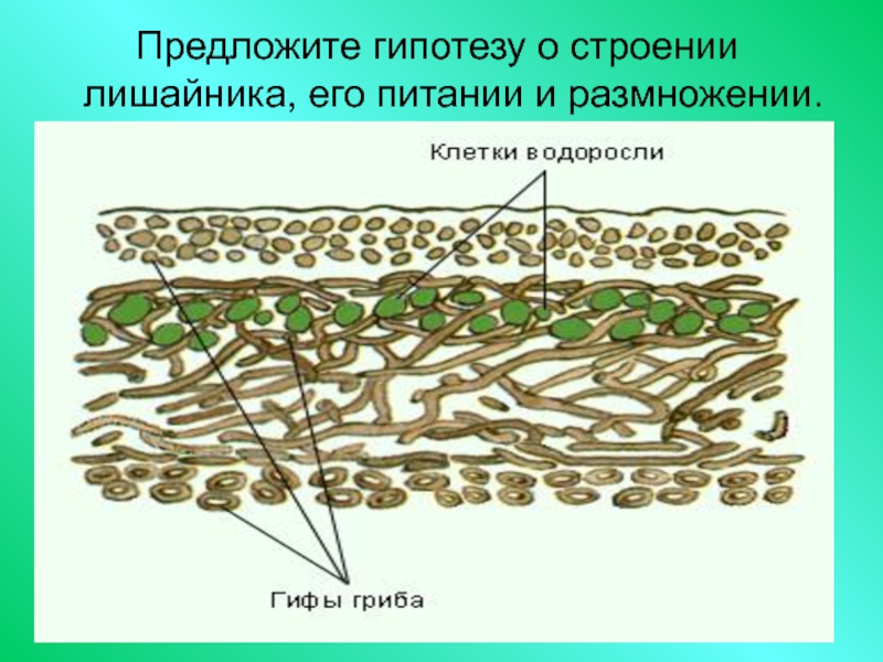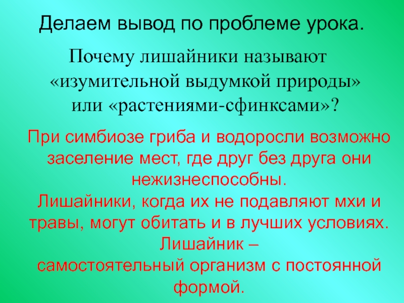 Для того чтобы существовала экосистема, необходимы живые организмы разных «профессий». (В Каких именно «профессий» и почему? О Попытайтесь вспомнить.) Только совместными усилиями они могут поддерживать круговорот веществ. (П Ответ на вопрос: почему?) Но в одном организме лишайника уже присутствуют и водоросли-производители, и грибы-потребители. Поэтому лишайник представляет собой не только отдельный организм, но и целую миниатюрную «экосистему», которая может жить самостоятельно. (П На какой вопрос мы нашли ответ?)
