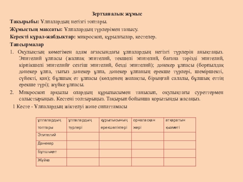 Жұмыстың мақсаты: Ұлпалардың түрлерімен танысу.