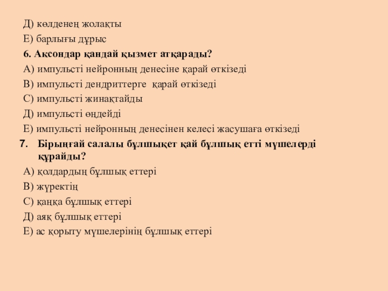 Е) импульсті нейронның денесінен келесі жасушаға өткізеді