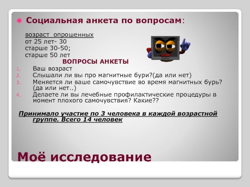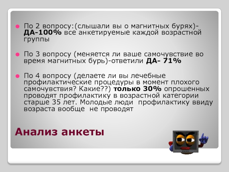По 3 вопросу (меняется ли ваше самочувствие во время магнитных бурь)-ответили ДА- 71%