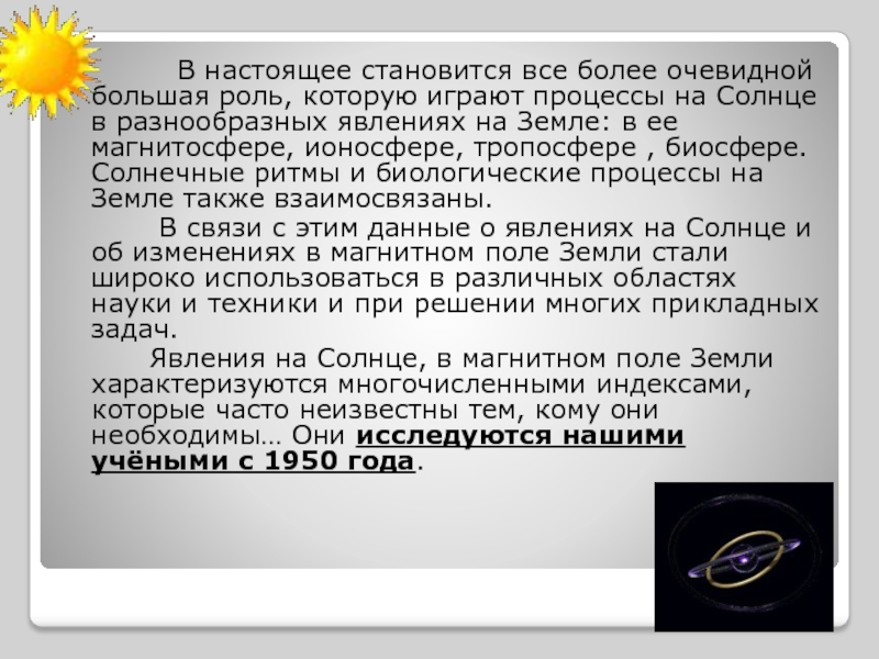 очевидной большая роль, которую играют процессы на Солнце в разнообразных явлениях на Земле: в ее магнитосфере, ионосфере, тропосфере , биосфере. Солнечные ритмы и биологические процессы на Земле также взаимосвязаны.