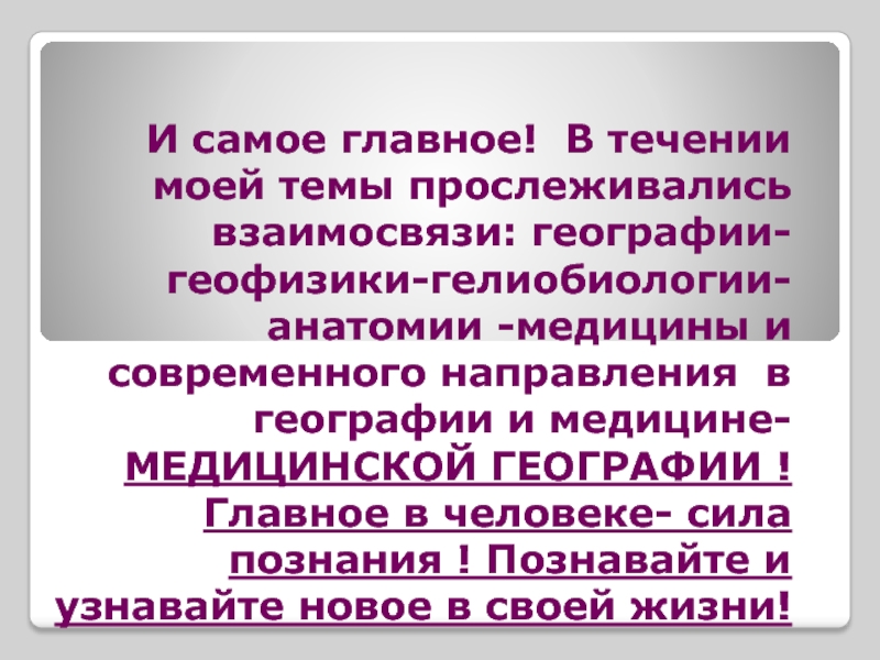 Слайд 33И самое главное! В течении моей темы прослеживались взаимосвязи: географии-геофизики-гелиобиологии-анатомии -медицины