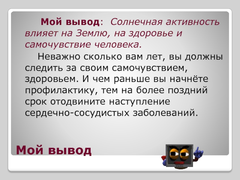 Слайд 23ВЫВОД 1: Магнитные бури оказывают отрицательное влияние на деятельность организма человека.