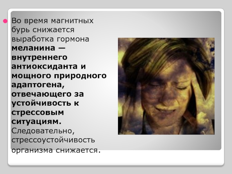 Слайд 14Во время магнитных бурь снижается выработка гормона меланина — внутреннего антиоксиданта
