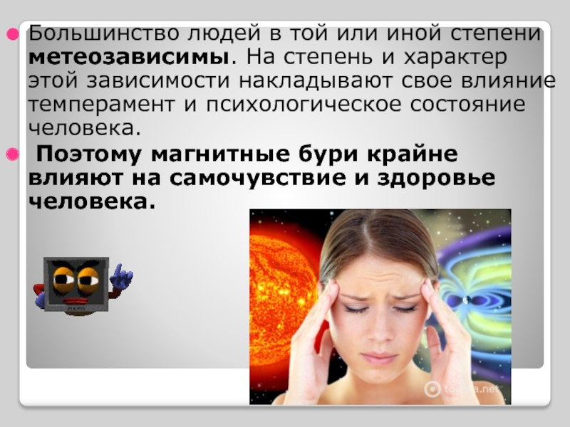 Слайд 10Большинство людей в той или иной степени метеозависимы. На степень и