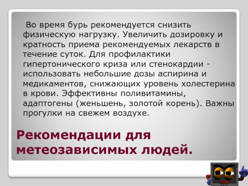 кратность приема рекомендуемых лекарств в течение суток. Для профилактики гипертонического криза или стенокардии - использовать небольшие дозы аспирина и медикаментов, снижающих уровень холестерина в крови. Эффективны поливитамины, адаптогены (женьшень, золотой корень). Важны прогулки на свежем воздухе.