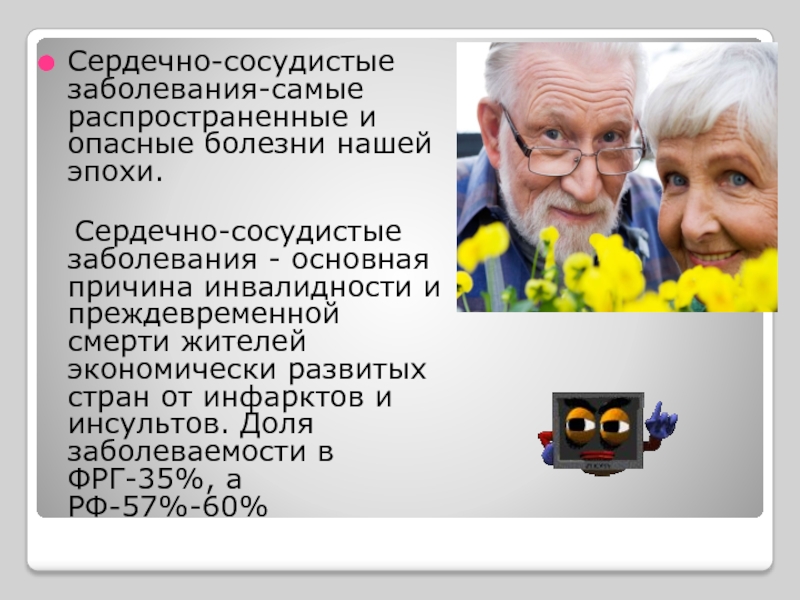 заболевания - основная причина инвалидности и преждевременной смерти жителей экономически развитых стран от инфарктов и инсультов. Доля заболеваемости в ФРГ-35%, а РФ-57%-60%