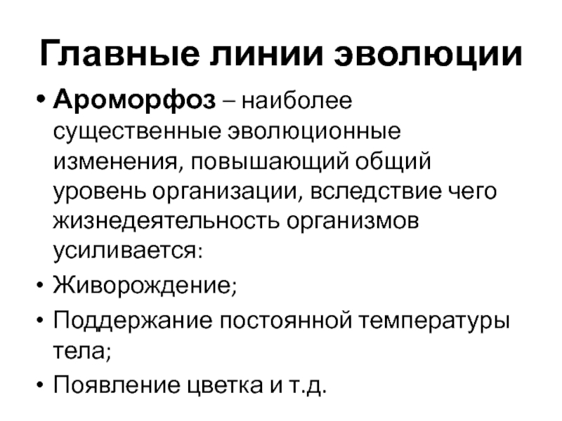 Главные линии эволюцииАроморфоз – наиболее существенные эволюционные изменения, повышающий общий уровень организации, вследствие чего жизнедеятельность организмов усиливается:Живорождение;Поддержание