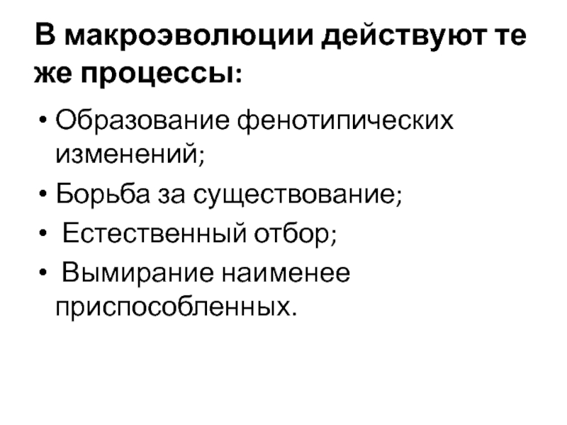 В макроэволюции действуют те же процессы:Образование фенотипических изменений;Борьба за существование; Естественный отбор; Вымирание наименее приспособленных.