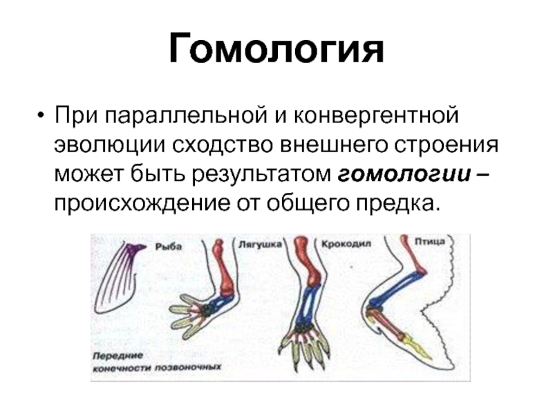 Гомология При параллельной и конвергентной эволюции сходство внешнего строения может быть результатом гомологии – происхождение от общего