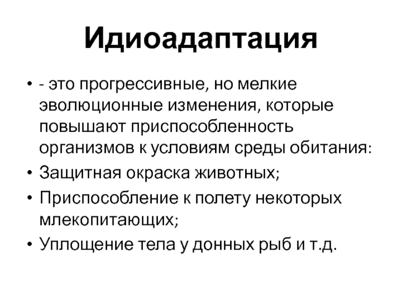Идиоадаптация - это прогрессивные, но мелкие эволюционные изменения, которые повышают приспособленность организмов к условиям среды обитания:Защитная окраска