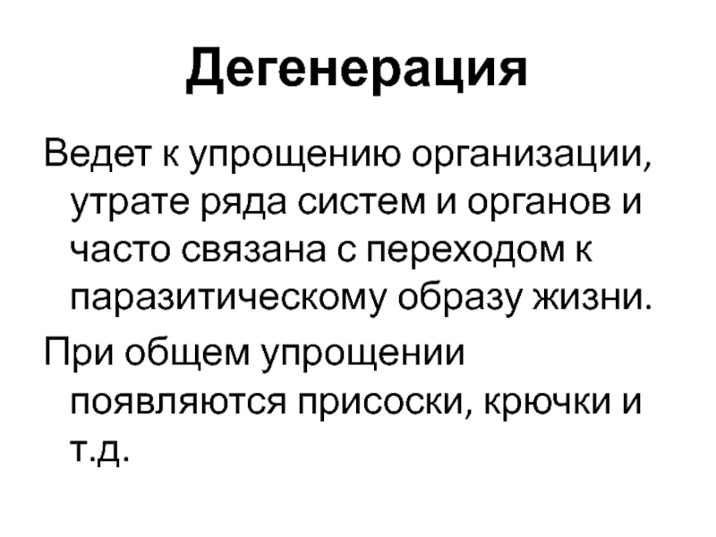 Дегенерация Ведет к упрощению организации, утрате ряда систем и органов и часто связана с переходом к паразитическому