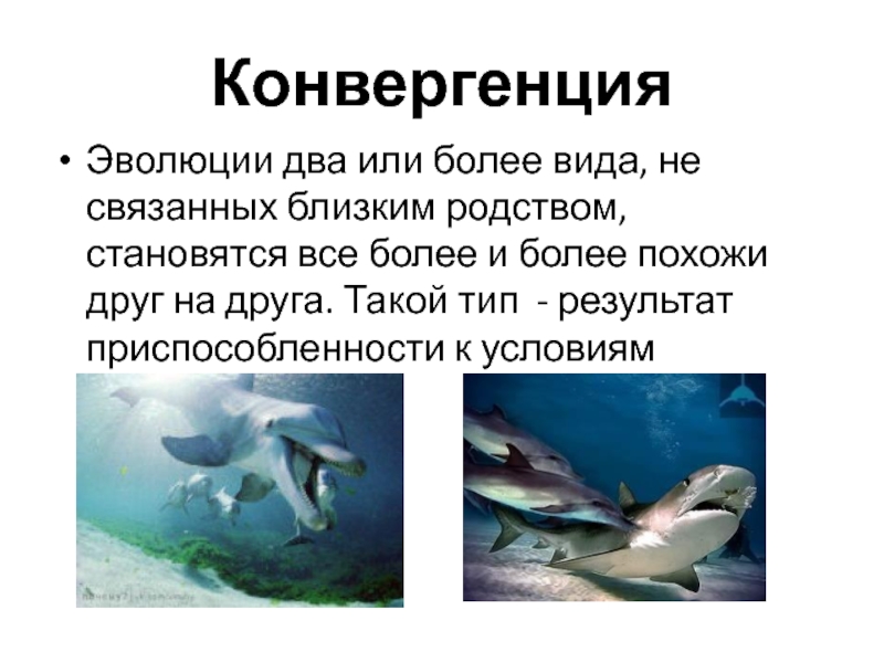 Конвергенция Эволюции два или более вида, не связанных близким родством, становятся все более и более похожи друг