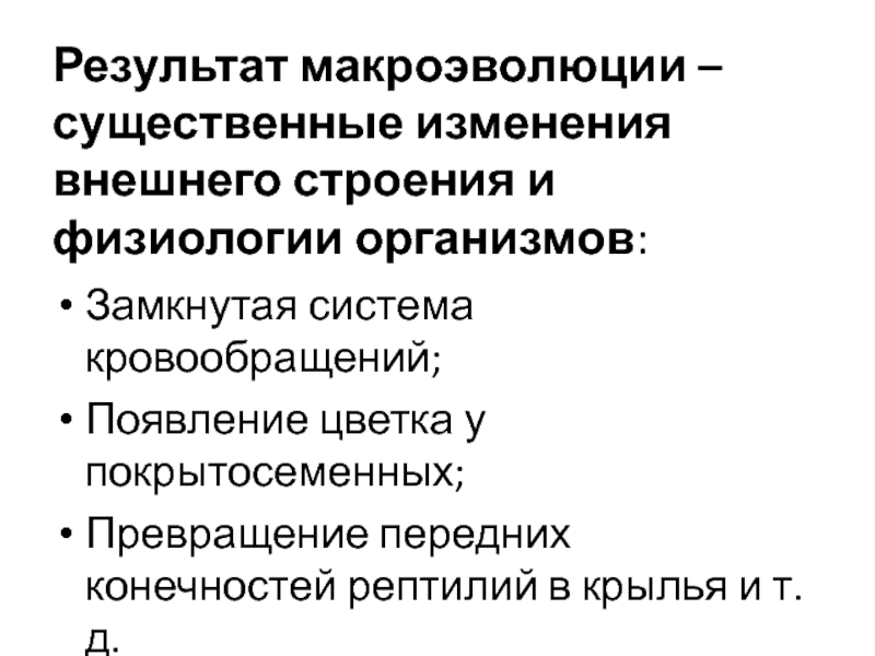 Результат макроэволюции – существенные изменения внешнего строения и физиологии организмов:Замкнутая система кровообращений;Появление цветка у покрытосеменных;Превращение передних конечностей