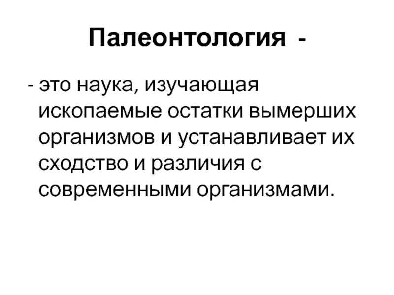 Палеонтология - - это наука, изучающая ископаемые остатки вымерших организмов и устанавливает их сходство и различия с
