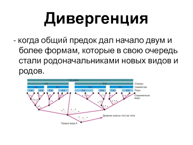 Дивергенция - когда общий предок дал начало двум и более формам, которые в свою очередь стали родоначальниками