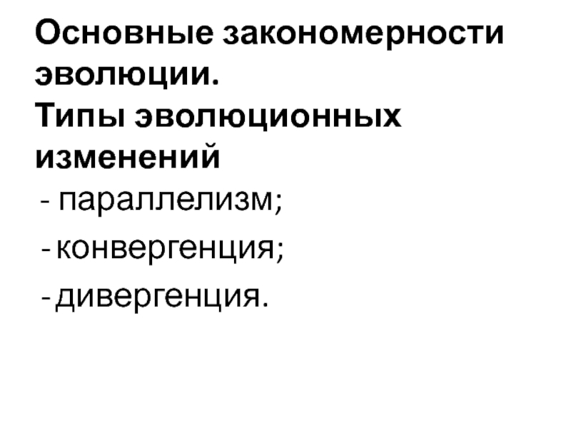 Основные закономерности эволюции.  Типы эволюционных изменений - параллелизм;конвергенция;дивергенция.