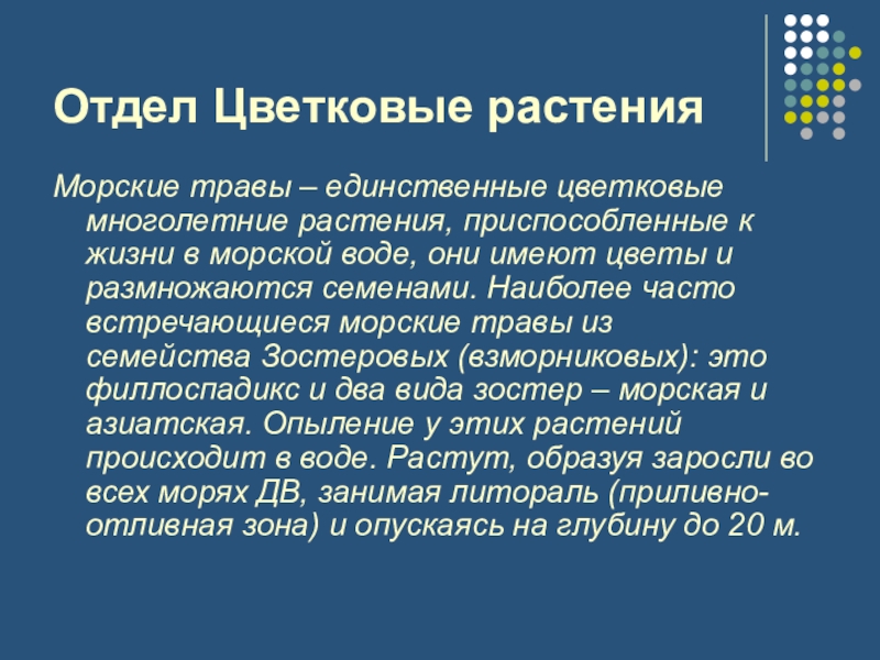 к жизни в морской воде, они имеют цветы и размножаются семенами. Наиболее часто встречающиеся морские травы из семейства Зостеровых (взморниковых): это филлоспадикс и два вида зостер – морская и азиатская. Опыление у этих растений происходит в воде. Растут, образуя заросли во всех морях ДВ, занимая литораль (приливно-отливная зона) и опускаясь на глубину до 20 м.