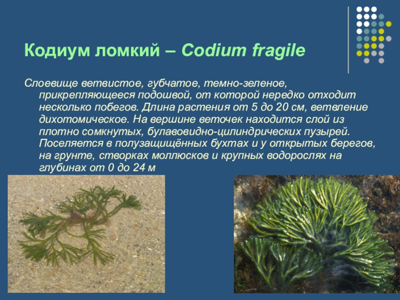 ярком свету светло-зеленое и беловатое, 15-30 см длины. Главные ветви ветвятся. Вегетирует в течение всего года, массовое развитие в конце весны – начале лета. Растет, прикрепляясь к грунту, водорослям и моллюскам на глубинах от нижней литорали до 13 м.