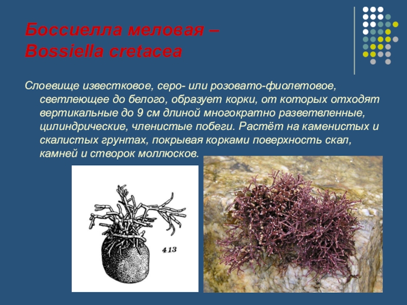 образует корки, от которых отходят вертикальные до 9 см длиной многократно разветвленные, цилиндрические, членистые побеги. Растёт на каменистых и скалистых грунтах, покрывая корками поверхность скал, камней и створок моллюсков.