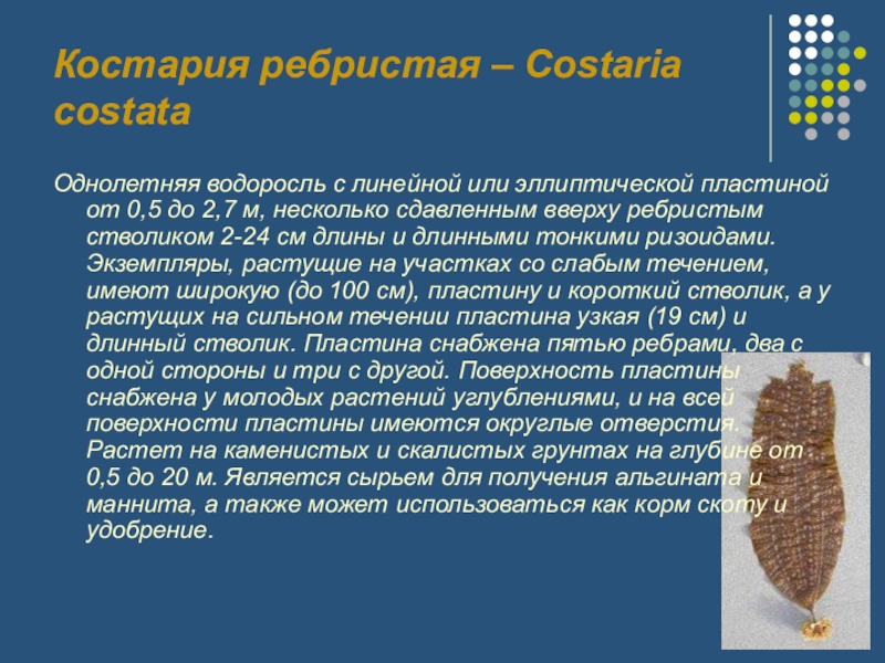 0,5 до 2,7 м, несколько сдавленным вверху ребристым стволиком 2-24 см длины и длинными тонкими ризоидами. Экземпляры, растущие на участках со слабым течением, имеют широкую (до 100 см), пластину и короткий стволик, а у растущих на сильном течении пластина узкая (19 см) и длинный стволик. Пластина снабжена пятью ребрами, два с одной стороны и три с другой. Поверхность пластины снабжена у молодых растений углублениями, и на всей поверхности пластины имеются округлые отверстия. Растет на каменистых и скалистых грунтах на глубине от 0,5 до 20 м. Является сырьем для получения альгината и маннита, а также может использоваться как корм скоту и удобрение.