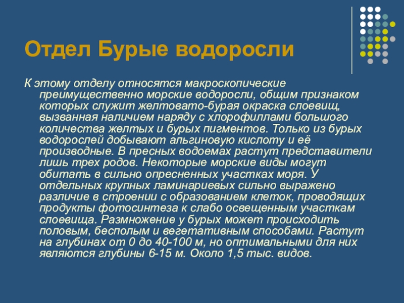 общим признаком которых служит желтовато-бурая окраска слоевищ, вызванная наличием наряду с хлорофиллами большого количества желтых и бурых пигментов. Только из бурых водорослей добывают альгиновую кислоту и её производные. В пресных водоемах растут представители лишь трех родов. Некоторые морские виды могут обитать в сильно опресненных участках моря. У отдельных крупных ламинариевых сильно выражено различие в строении с образованием клеток, проводящих продукты фотосинтеза к слабо освещенным участкам слоевища. Размножение у бурых может происходить половым, бесполым и вегетативным способами. Растут на глубинах от 0 до 40-100 м, но оптимальными для них являются глубины 6-15 м. Около 1,5 тыс. видов.